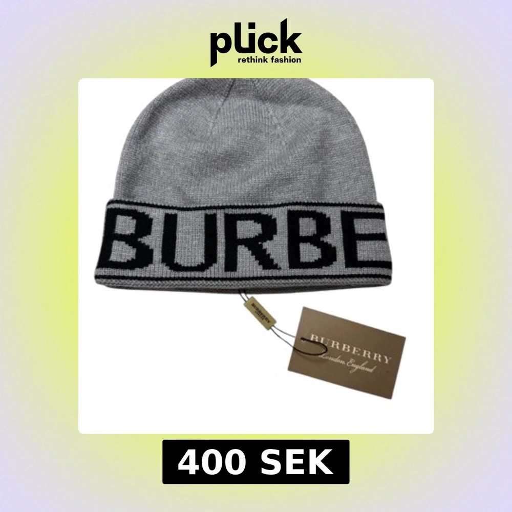 Snygg grå stickad mössa från Burberry med bred svart logotyp runt kanten. Klassisk form med uppvikt kant och tydlig Burberry-tag. Perfekt för dig som vill ha en stilren och lyxig accessoar med street-vibe.