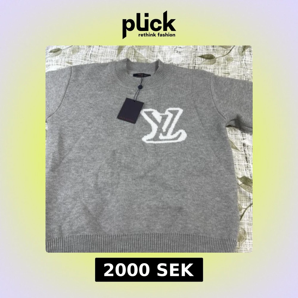 Snygg grå stickad tröja från Louis Vuitton med stort vitt LV-logo både fram och bak. Tröjan har rund halsringning och ribbade muddar vid ärmslut och nederkant. Perfekt för dig som vill ha en exklusiv och stilren look.
