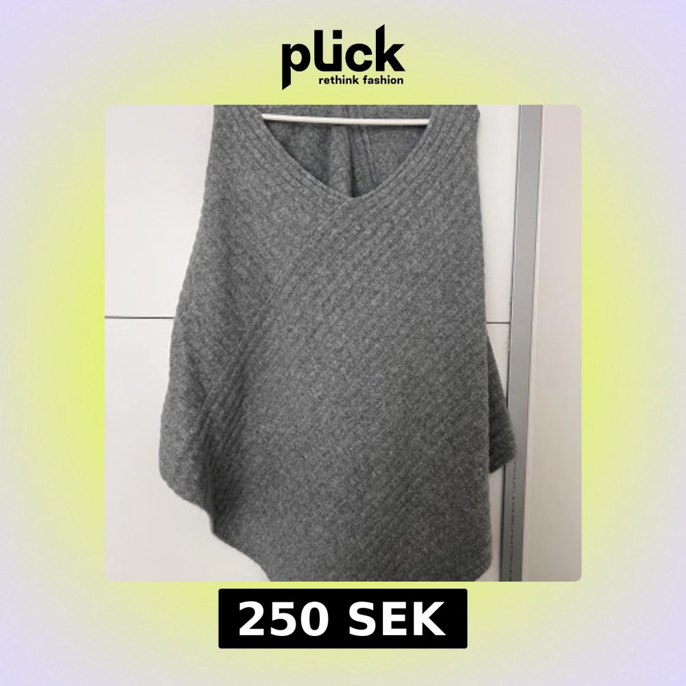 Säljer en stilren grå stickad poncho med v-ringning. Perfekt för kyliga dagar och ger en mysig känsla. Den har en enkel design med ett diskret mönster som ger textur.