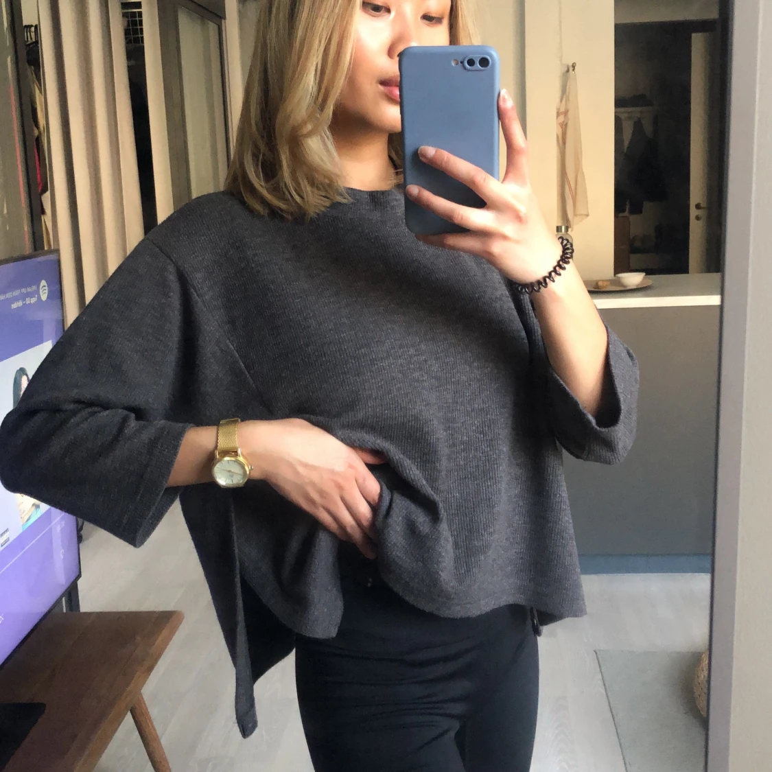 Grå stickad trekvartsstickad tröja med slit detail på sidan och boxig form. Köparen står för frakten 💜