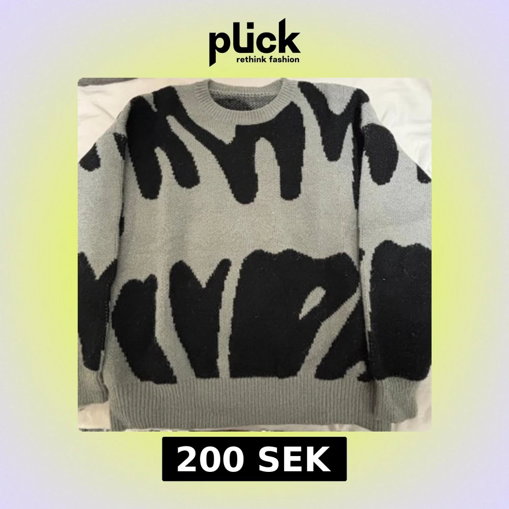 Säljer en grå stickad tröja med unikt svart abstrakt mönster. Tröjan har rund halsringning, ribbade muddar och är långärmad. Tröjan är knappt använd och i storlek L men liten i storleken så passar mer M/S