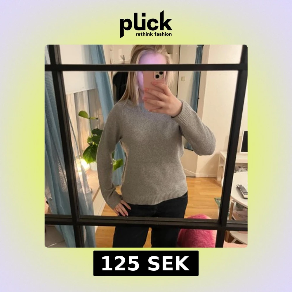 En enkel och stilren grå stickad tröja med rund halsringning och ribbade muddar vid ärmslut och nederkant. Använd fåtal gånger!🩶