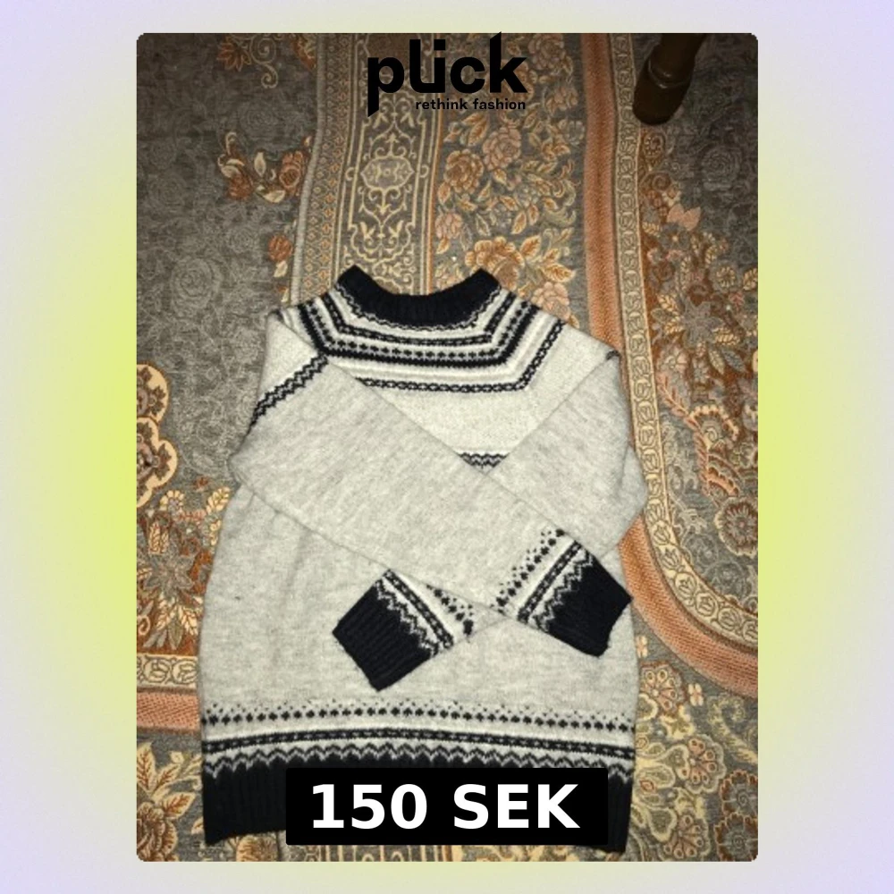 Säljer en grå stickad tröja från Esmara med mörkblå och vita detaljer i ett snyggt mönster runt halsen, ärmsluten och nederkanten. Tröjan har långärmad passform och ribbade muddar. Perfekt för kalla dagar och riktigt mysig stil.