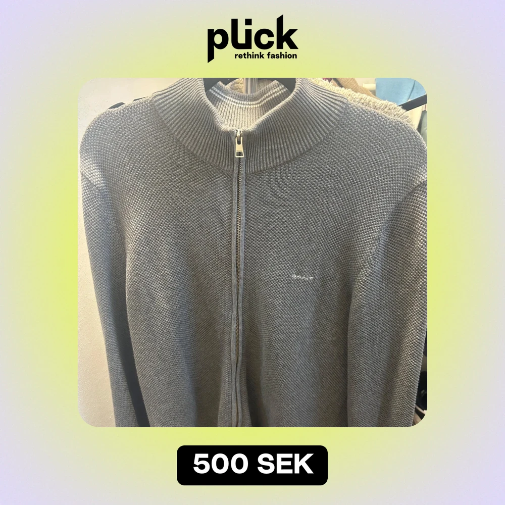 Säljer en stilren grå stickad tröja från GANT. Den har en dragkedja framtill och en hög krage som håller dig varm.