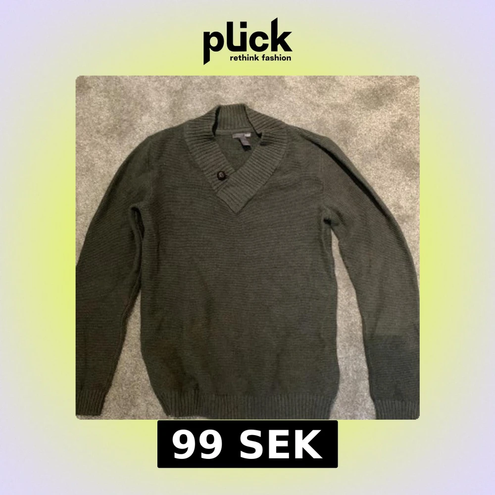 Säljer en grön stickad tröja från H&M med en snygg v-ringning och knappdetalj. Perfekt för kyligare dagar med sin ribbade krage och långa ärmar. Passar bra till både jeans och chinos. Det finns flera fläckar, skick 5,5/10