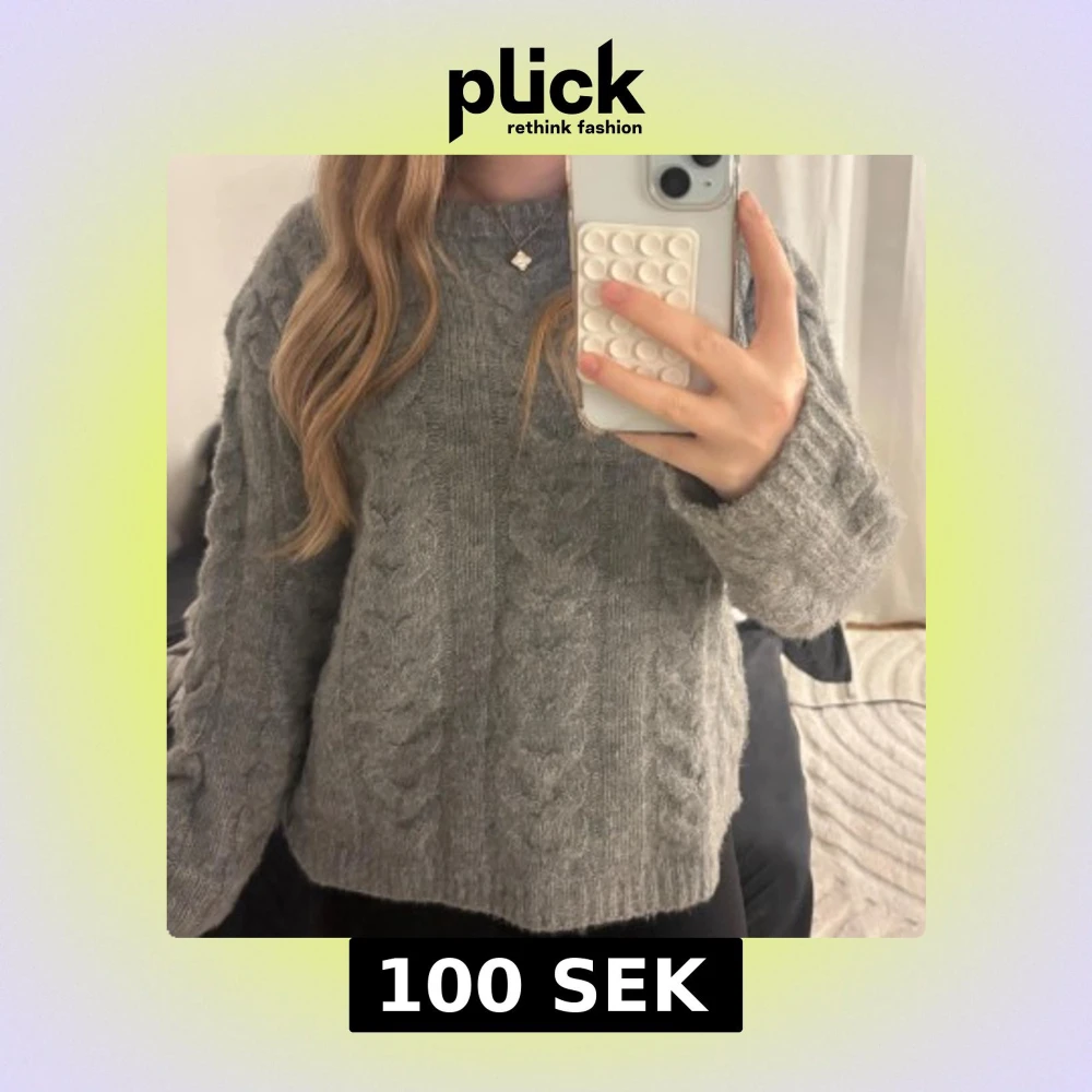 Mysig grå stickad tröja med kabelstickat mönster framtill och på ärmarna. Tröjan har en rund hals och långa ärmar, perfekt för kyliga dagar. Den har en loose passform och är tillverkad i ett mjukt material som känns skönt mot huden.