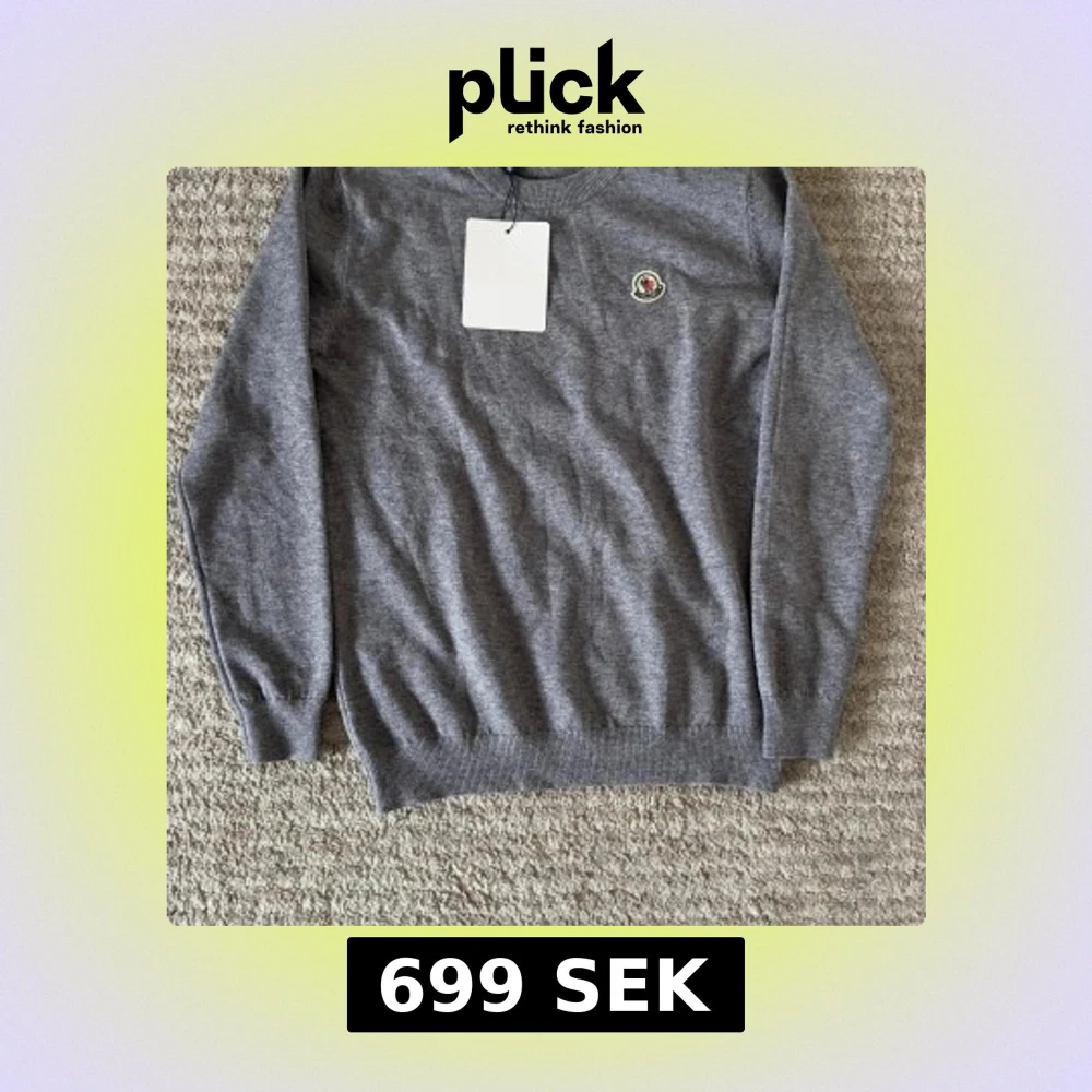 Snygg grå stickad tröja från Moncler med klassisk rund halsringning och broderad logotyp på bröstet. Tröjan har ribbade muddar vid ärmslut och nederkant, perfekt för lager-på-lager under kyliga dagar.
