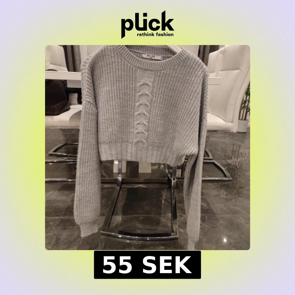 Säljer en snygg grå stickad tröja från NA-KD. Tröjan är croppad med ett flätat mönster framtill och har långa ärmar. Perfekt för en stilren look.