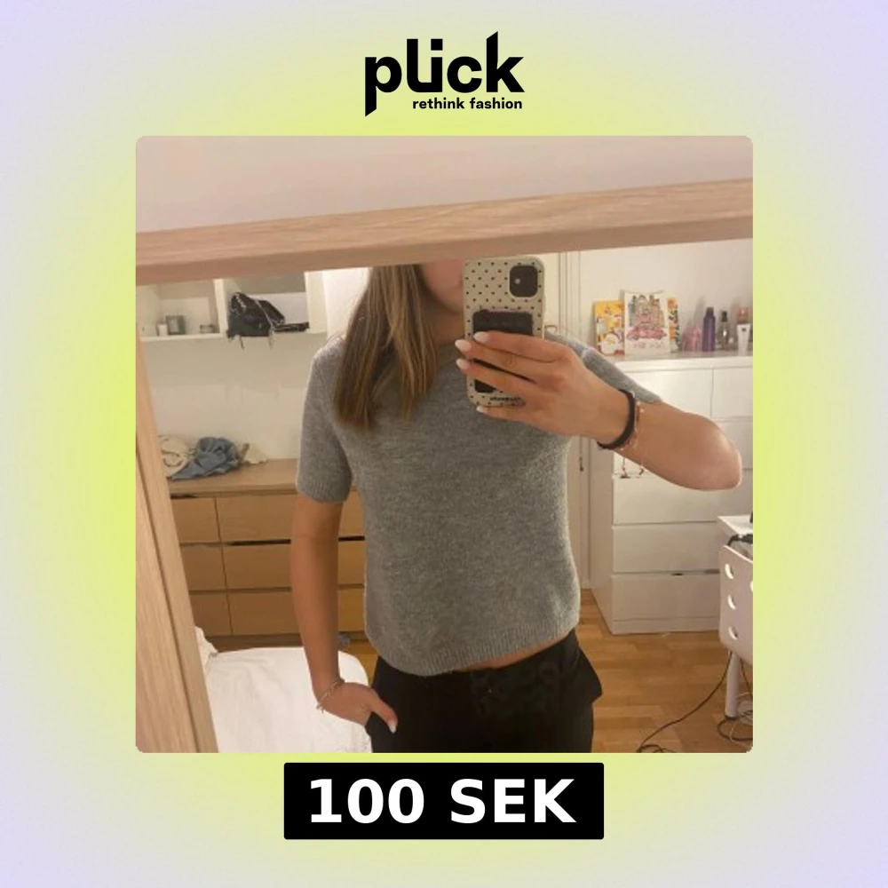 Mysig grå stickad tröja från Zara i storlek S. Tröjan har korta ärmar, rund hals och en enkel💕 nästan inte använd