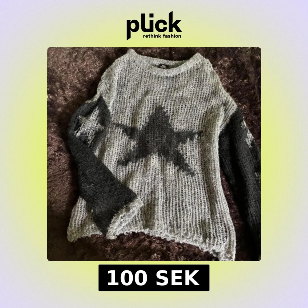 säljer en grå stickad tröja från urban outfitters med stjärna på bröstet och ärmarna. tröjan har en loose fit och gjord i ett grovmaskigt, fluffigt material 👍🏻