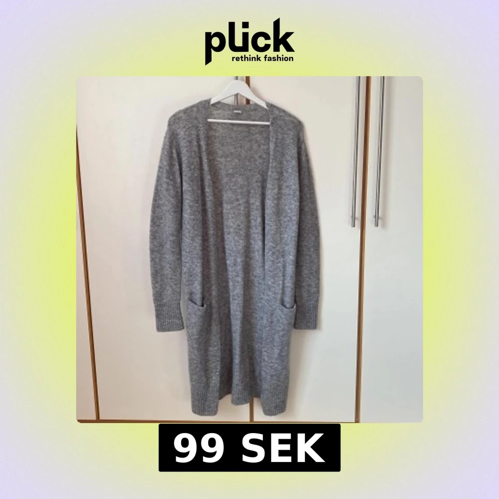 En mysig gråmelerad långkofta från Lindex. Mjukt material med ull och mohair, samt sköna fickor. Den har långa ärmar och praktiska fickor framtill. Koftan är en öppen modell som saknar knäppning. Längd 108 cm. Storlek M/L.