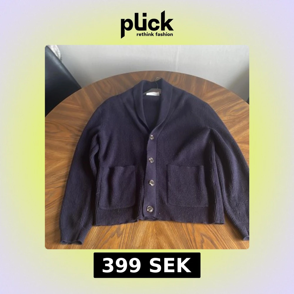 Snygg mörkblå stickad kofta från Filippa K med ribbad struktur, stora silvriga knappar och två praktiska fickor framtill. Koftan har en avslappnad passform och sjalkrage som ger en chill och stilren vibe. Perfekt att slänga på sig när det är kyligt ute.