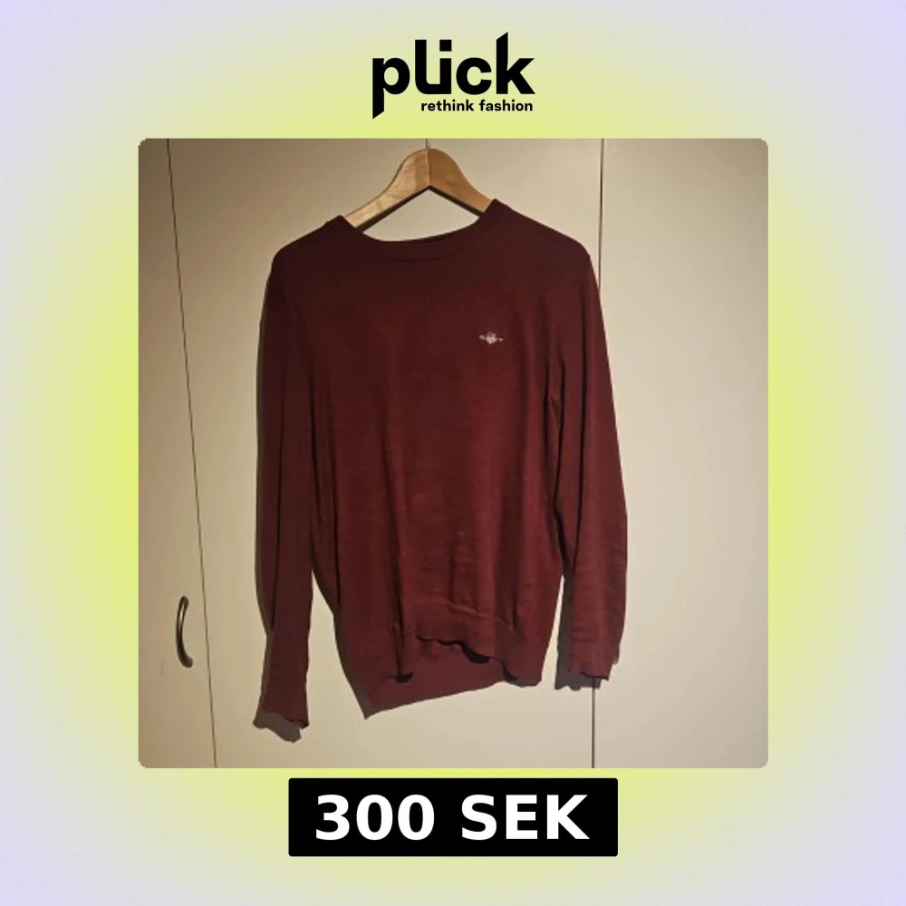 Vinröd stickad tröja från Gant med rund hals och broderad logga på bröstet. Tröjan är i herrstorlek small och som syns på bild så har tröjan en liten lagning i höger armhåla. Förutom det så är tröjan i bra skick och den fyller sitt syfte.