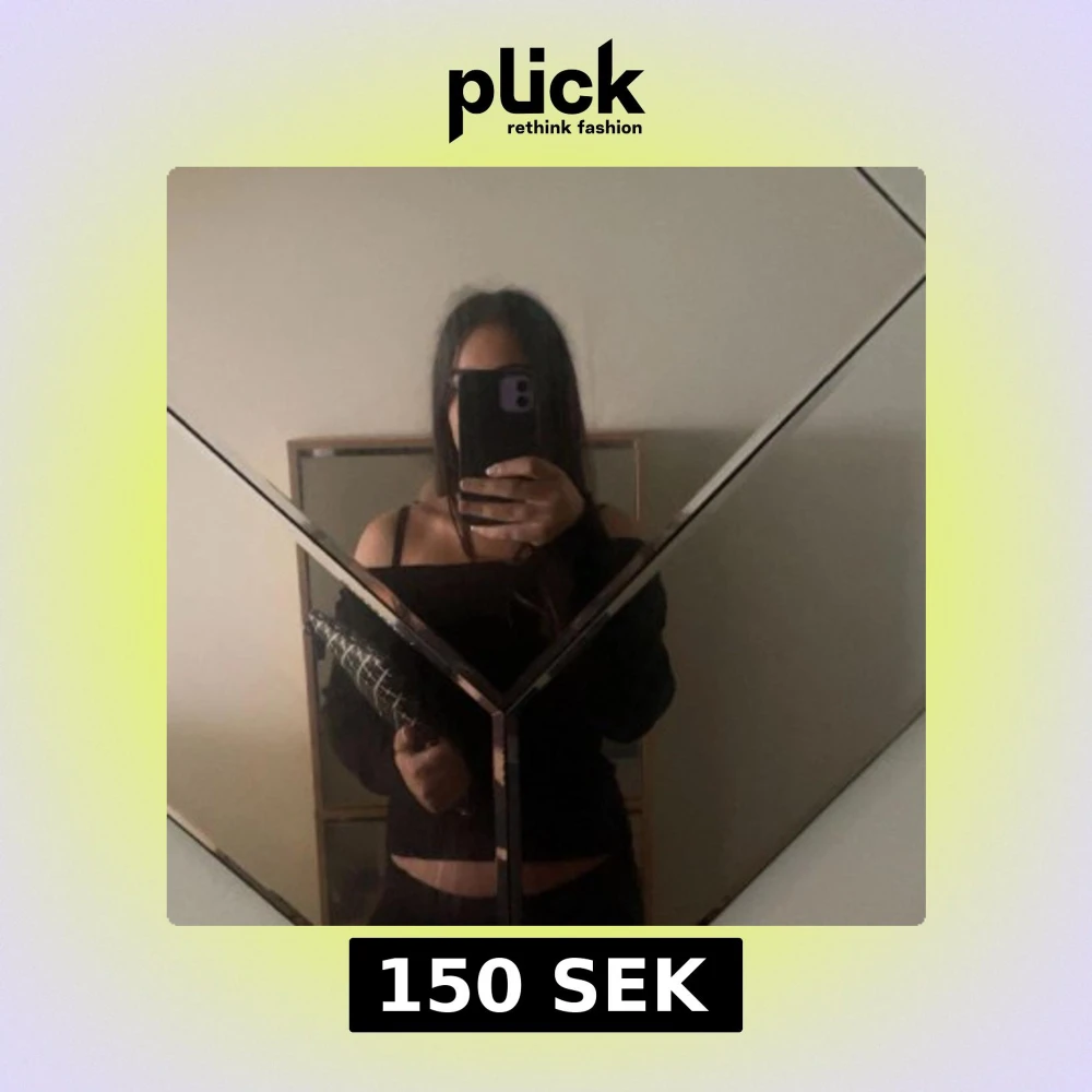 Säljer en svart stickad tröja med ribbad struktur och offshoulder-modell. Tröjan har långa ärmar och sitter snyggt croppad över midjan. Perfekt för dig som gillar en trendig och stilren look.