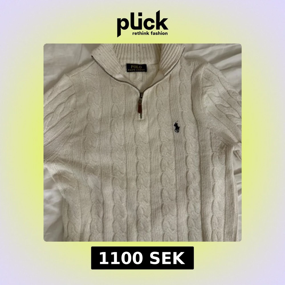 Säljer en stilren vit stickad tröja från Ralph Lauren med kabelstickat mönster och dragkedja vid halsen. Tröjan har en broderad logotyp på bröstet och en hög krage för extra värme. Perfekt för kyliga dagar! Riktig sexig alltså