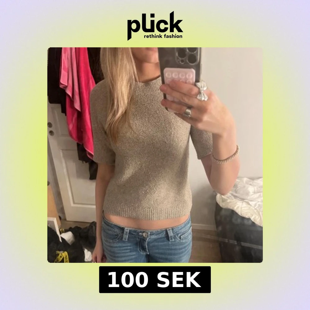 Säljer en beige stickad tröja med korta ärmar. Tröjan har en ribbad kant vid ärmslut och nederkant, vilket ger en snygg och bekväm passform. Perfekt för en stilren och avslappnad look.🩷