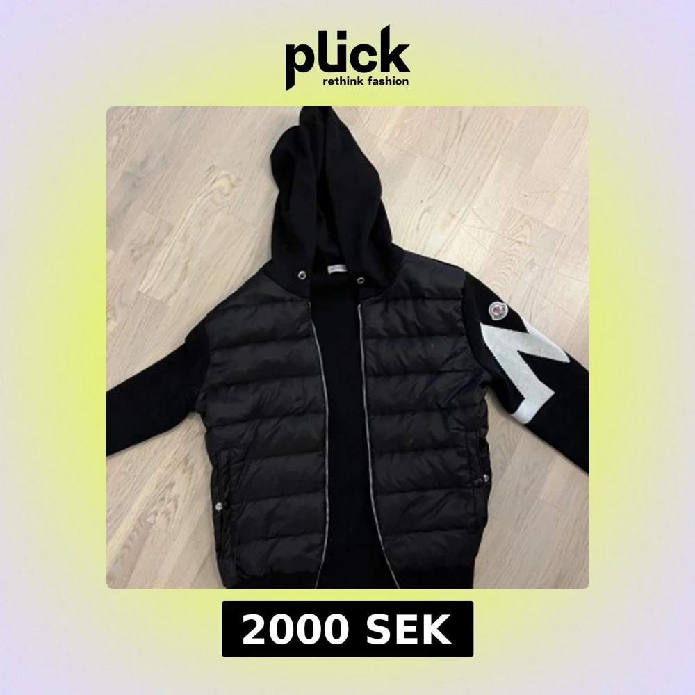 Svart pufferjacka från Moncler med huva och dragkedja framtill. Jackan har stickade ärmar med vit zigzag-mönster och Moncler-logga på ena ärmen. Kroppen är quiltad och har två fickor med knappstängning. Jag har använt jackan i ungefär en månad. Säljer jackan eftersom jag inte har behov av den längre. Jackan är i storlek M men passar också bra om du har storlek S. Själv har jag storlek S och den passar perfekt. Jag kan frakta om det behövs(: jackan kommer men en moncler zip påse.