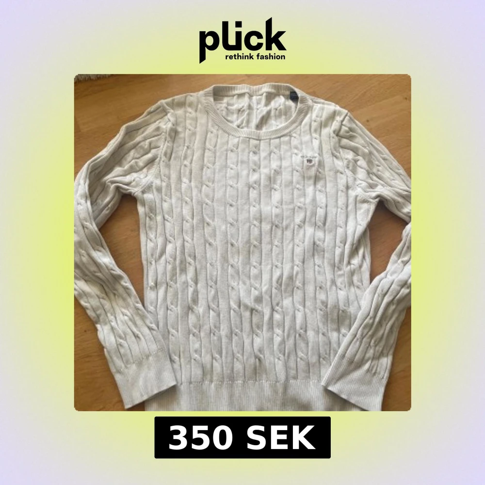 Snygg vit kabelstickad tröja från GANT med rund hals och broderad logga på bröstet. Tröjan är i storlek 158/164. Fint skick och knappt använd, inga fläckar eller missfärgningar.