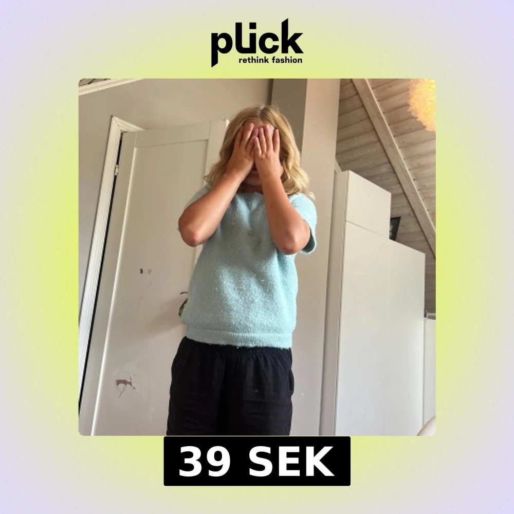 Supermjuk ljusblå stickad tröja med korta ärmar och rund hals. Tröjan har en fluffig känsla och ribbade kanter vid ärmslut och nederkant. Perfekt för dig som gillar en chill och enkel stil.
