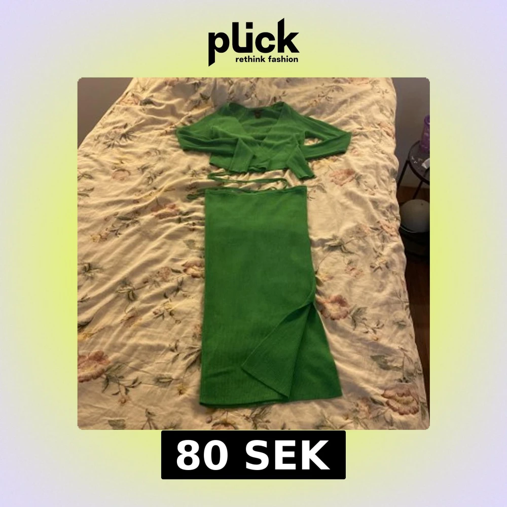 Snygg grön ribbad långkjol och topp från Lindex i stickad kvalitet. Kjolen har en omlott-look med slits framtill och toppen har ett knytband i midjan. Perfekt för dig som vill ha ett trendigt och bekvämt sett med lite extra edge.