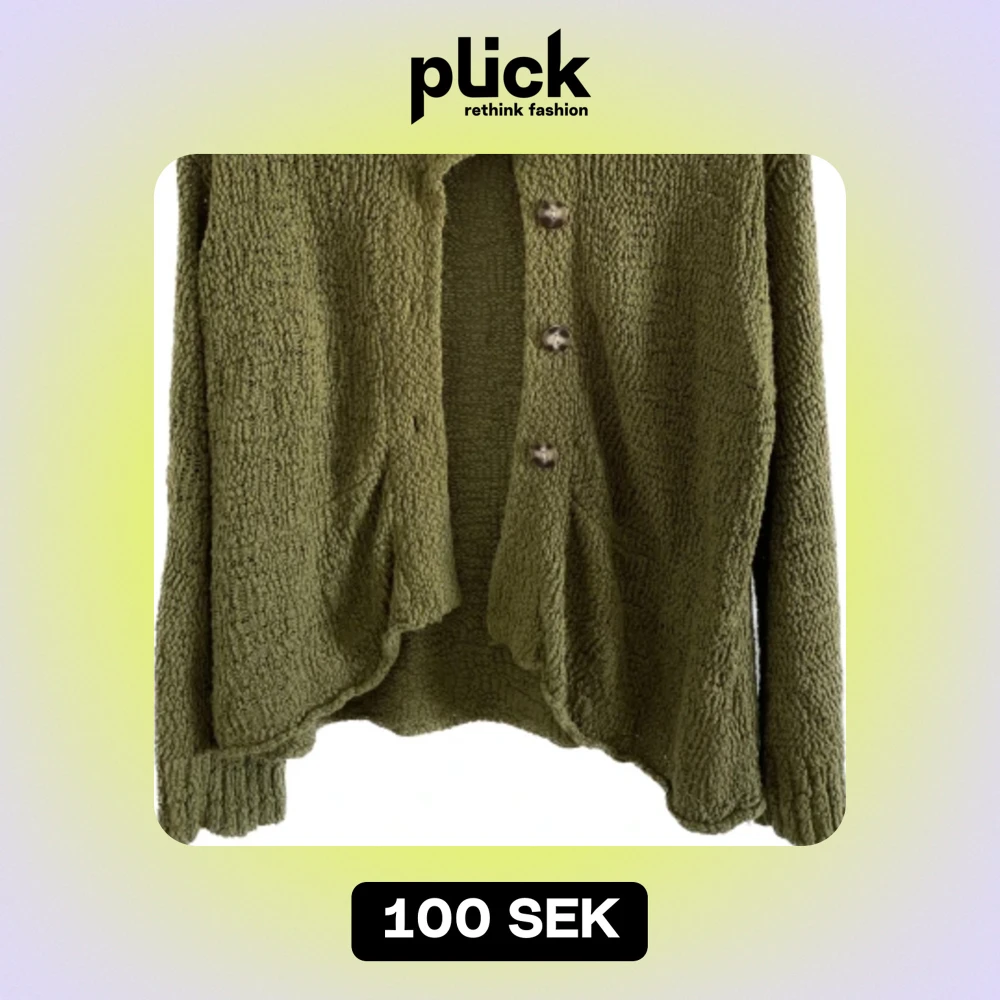 Stickad grön kofta med vida ärmar, 70% bomull 30% nylon. Fint skick! Garnet har lite glitterdetaljer