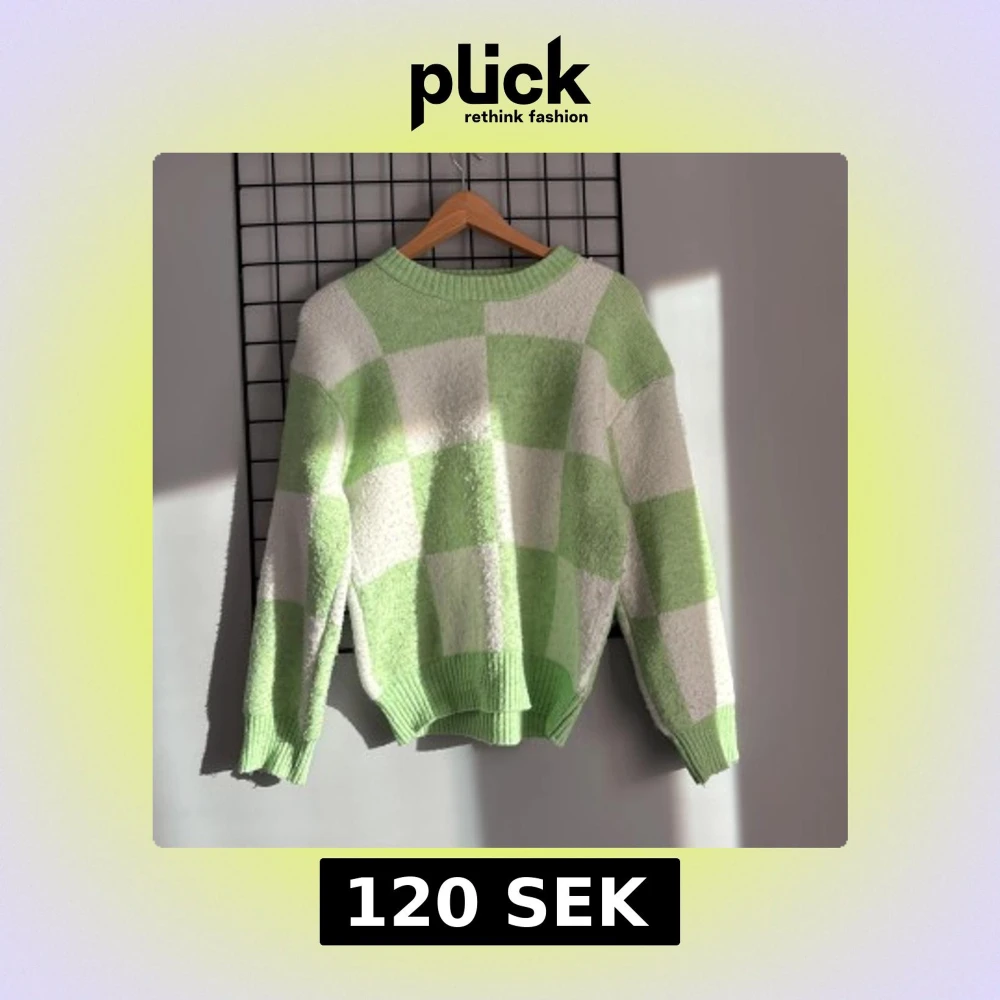 Supermysig stickad tröja med stora gröna och vita rutor. Tröjan har rund hals, ribbade muddar och en loose fit som ger en chill vibe. Perfekt för dig som gillar färg och vill sticka ut lite extra i vardagen.