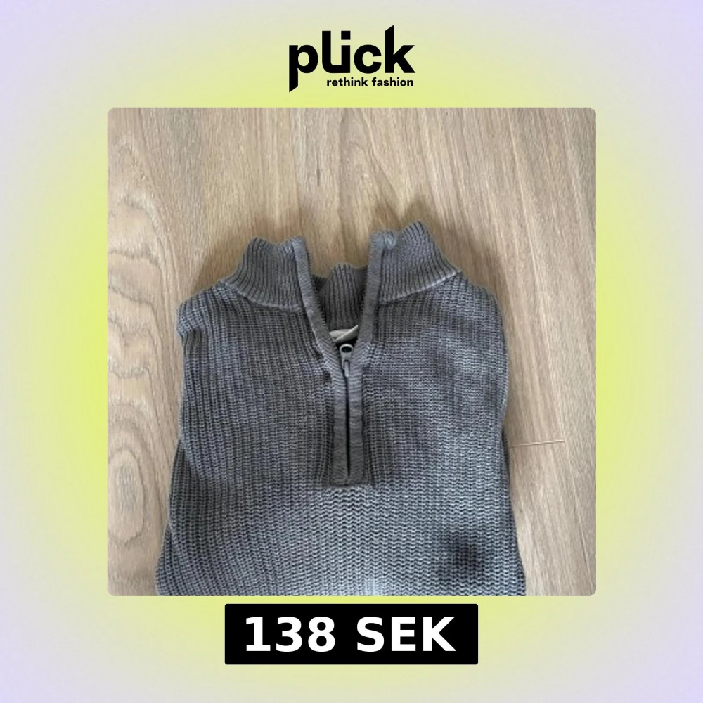 Säljer en grå stickad tröja med halv dragkedja och hög krage. Tröjan har lång ärm och ribbade muddar vid ärmslut och nederkant. Perfekt för kyliga dagar och enkel att matcha med olika outfits.