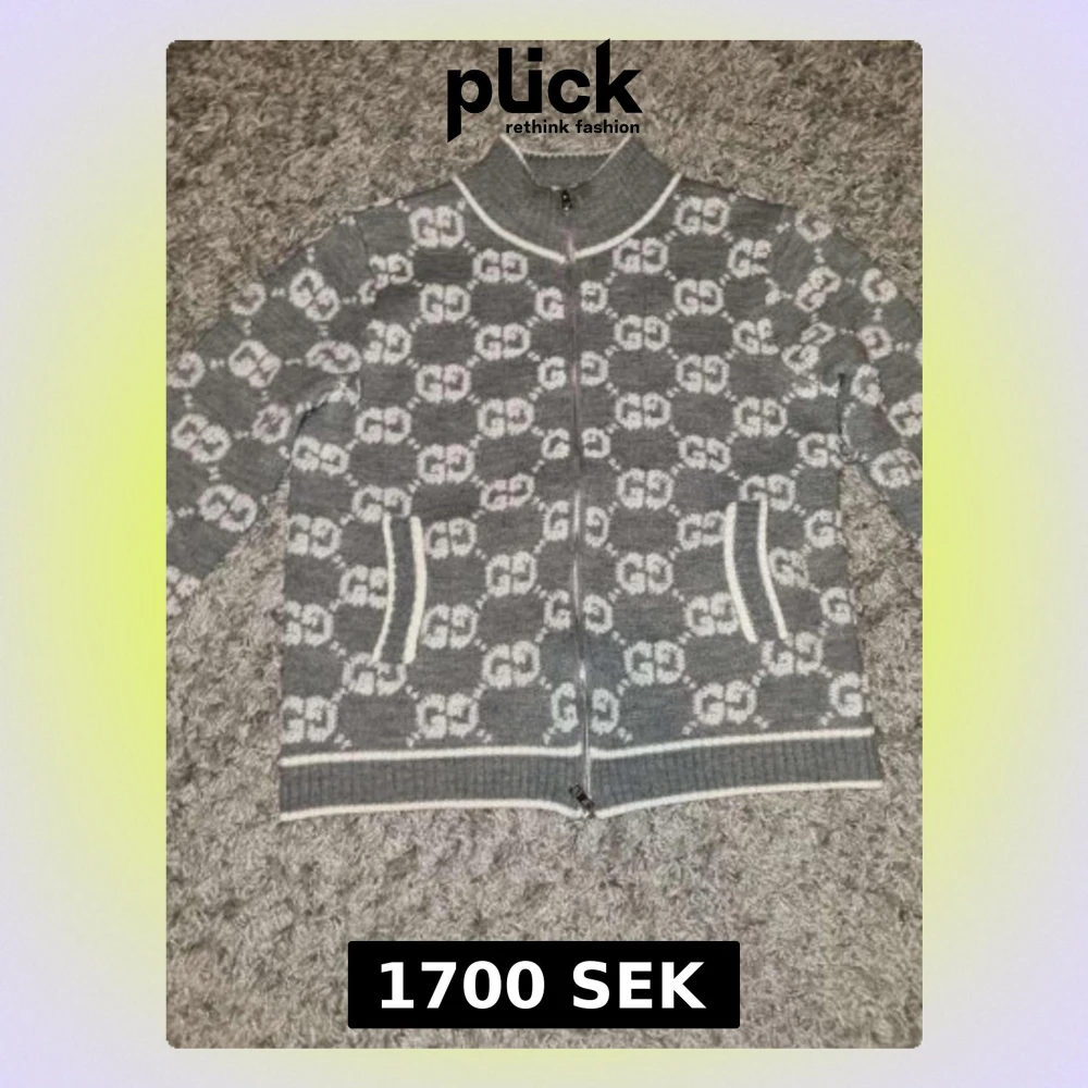 Säljer en grå stickad cardigan jacka från Gucci med vit GG-logga över hela jackan. Jackan har dragkedja framtill, ribbade muddar och vita detaljer vid krage, fickor och nederkant. Perfekt för dig som vill ha en snygg och trendig look. Pris går att diskutera.