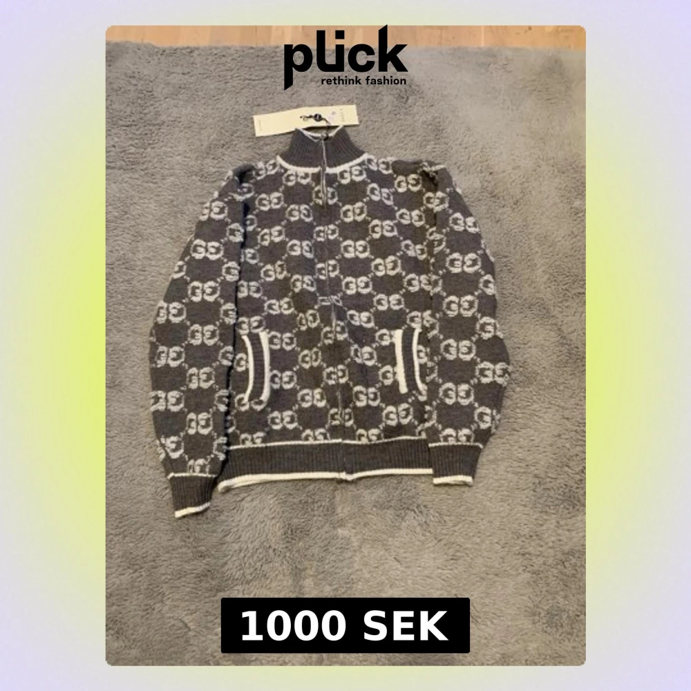Säljer en grå och vit stickad kofta från Gucci med GG-logga över hela plagget. Koftan har dragkedja framtill, ribbad krage och muddar samt två fickor med vit kant. Perfekt för dig som gillar lyxiga och snygga detaljer. Storlek S