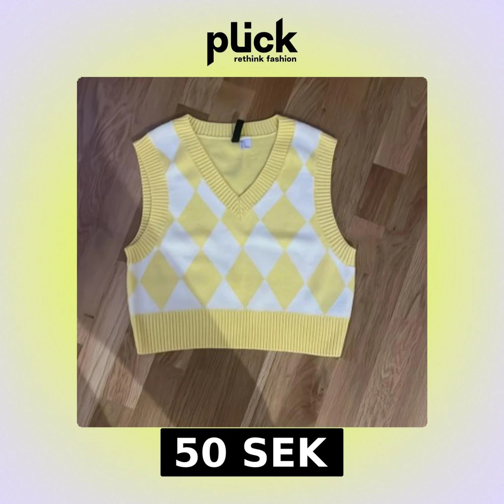 Superfin croppad stickad väst från H&M Divided i storlek S. Västen har ett gult och vitt rutig argylemönster framtill, bred ribbad kant vid ärmhål, nederkant och v-ringad hals. Perfekt att styla över en skjorta eller t-shirt för en trendig look.alldrig anndvänd
