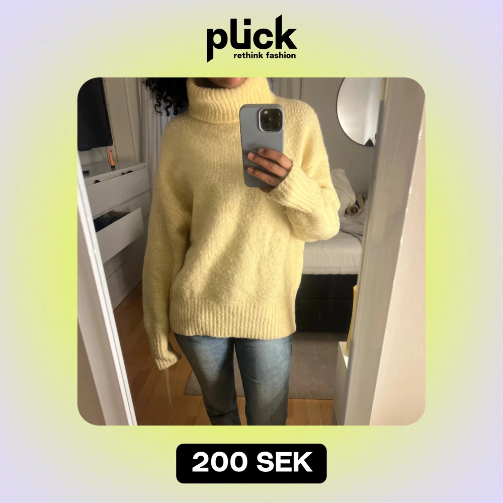 Mysig gul stickad polotröja med hög polokrage och långa ärmar.