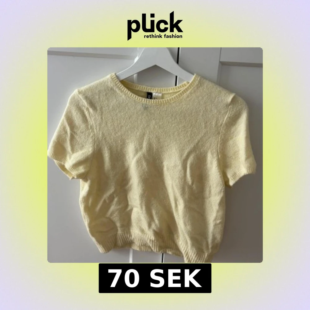 Superfin ljusgul stickad topp från H&M Divided. Modellen har korta ärmar, rund halsringning och ribbade kanter. Perfekt för dig som gillar en enkel men söt look med mjuk känsla.