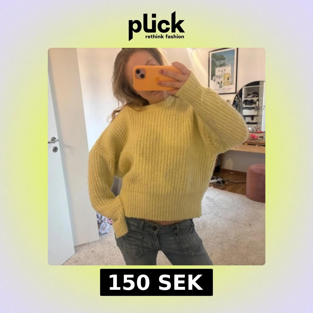Säljer en mysig gul stickad tröja med ribbad struktur. Tröjan har långa ärmar och en avslappnad passform som är perfekt för kyligare dagar. Passar bra till jeans eller kjol för en avslappnad look. Perfekt för höst och vinter!