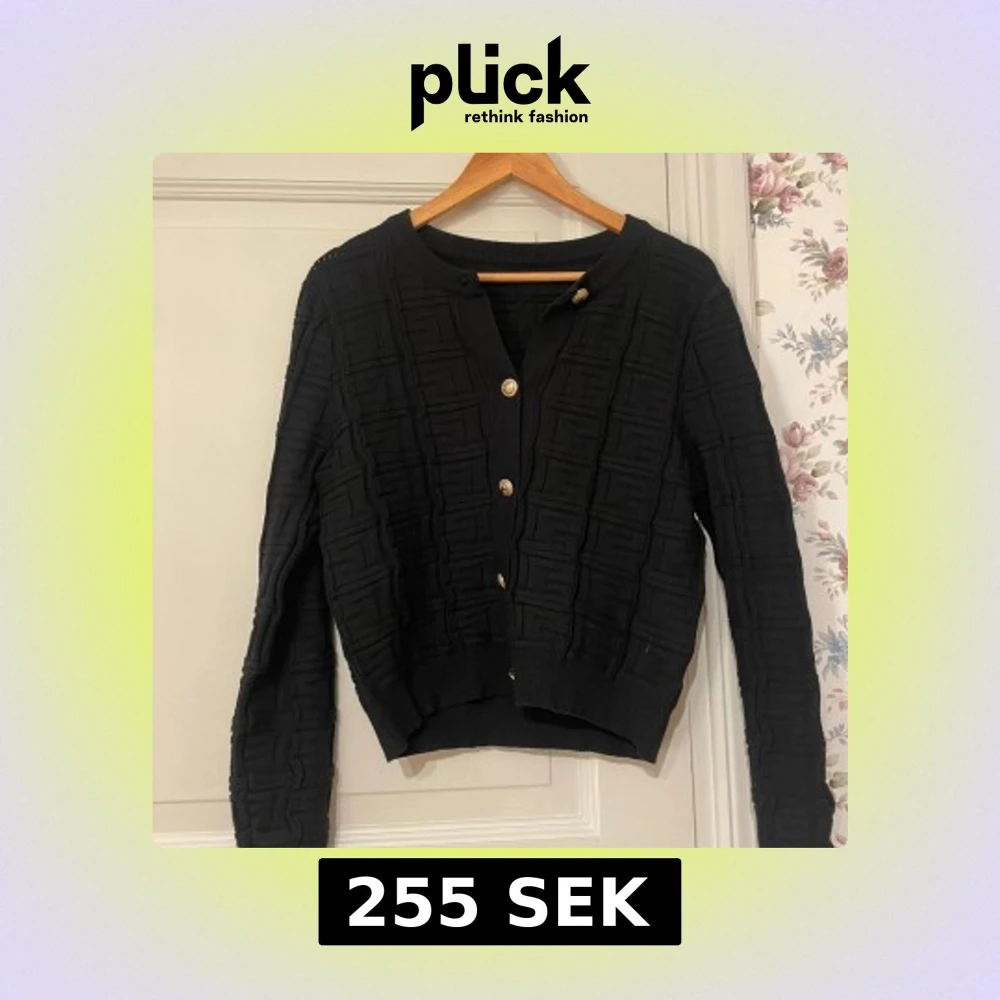 Stilren svart kofta med markerat mönster och snygga guldknappar framtill. Rund halsringning och ribbade muddar. Fint skick