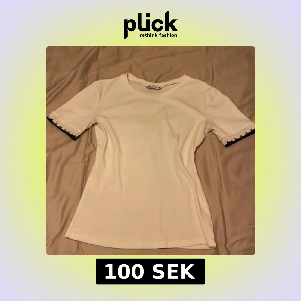 Vit t-shirt från Zara med rund hals och korta ärmar. Ärmsluten har en snygg stickad kant i vitt och svart med små paljettdetaljer som ger en unik touch. Modellen är figurnära och passar perfekt till jeans eller kjol. Materialet känns mjukt och skönt mot huden.