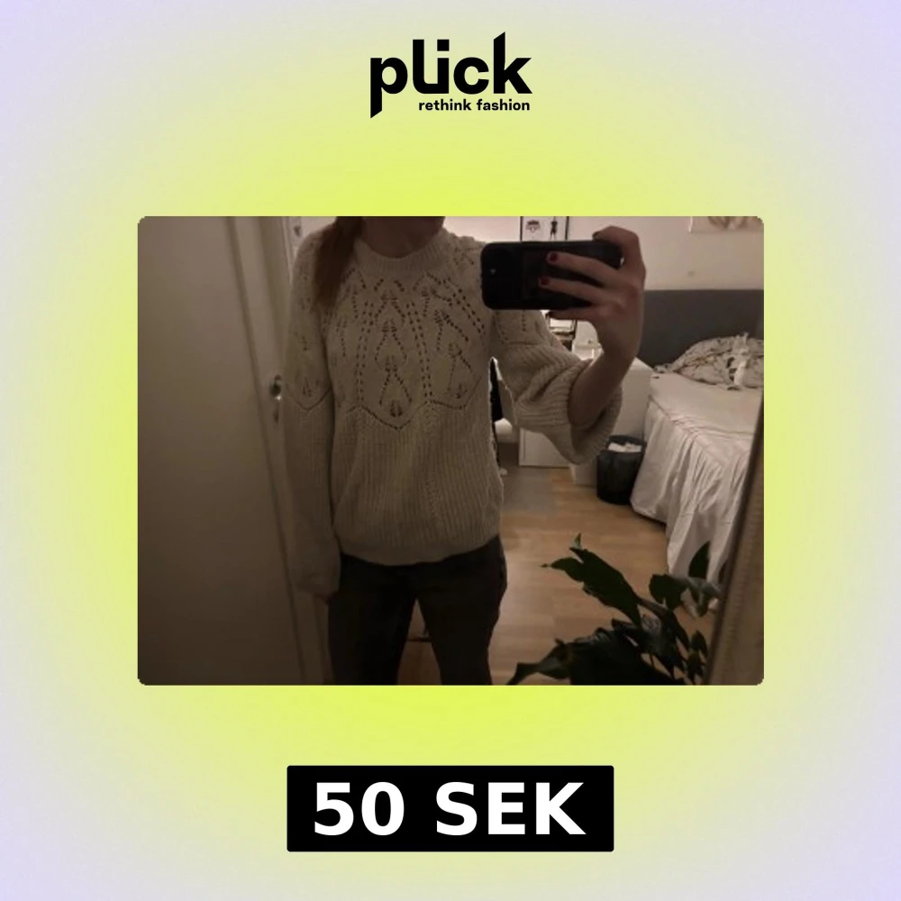 Säljer en beige stickad tröja med snyggt hålmönster och rund hals. Tröjan har långärmade, lite puffiga ärmar och ribbade muddar vid ärmslut och nederkant. Perfekt för dig som gillar mysiga och trendiga plagg med lite extra detaljer.