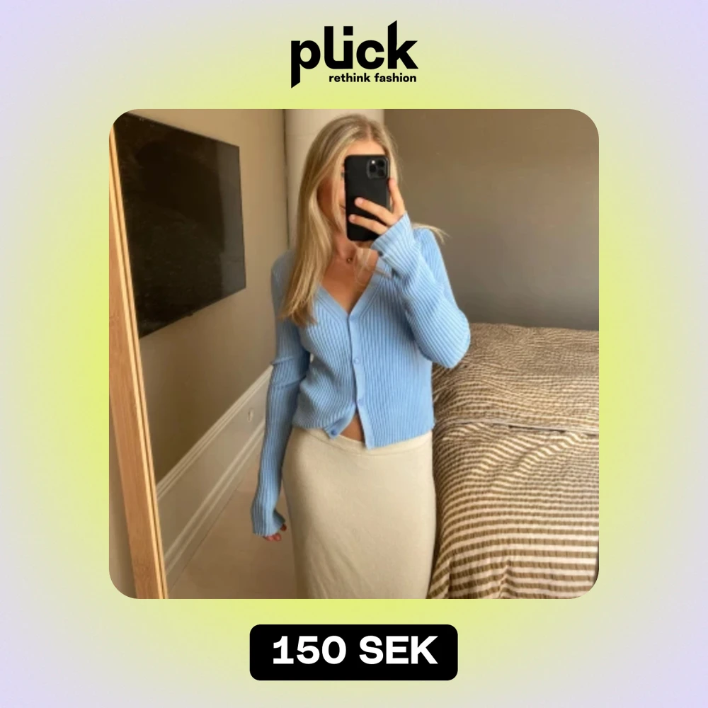 Säljer denna blåa stickade tröjan från H&M. Den är M, men är ganska liten i storleken då jag vanligtvis har S. Superfin färg nu till sommaren!🩵🩵