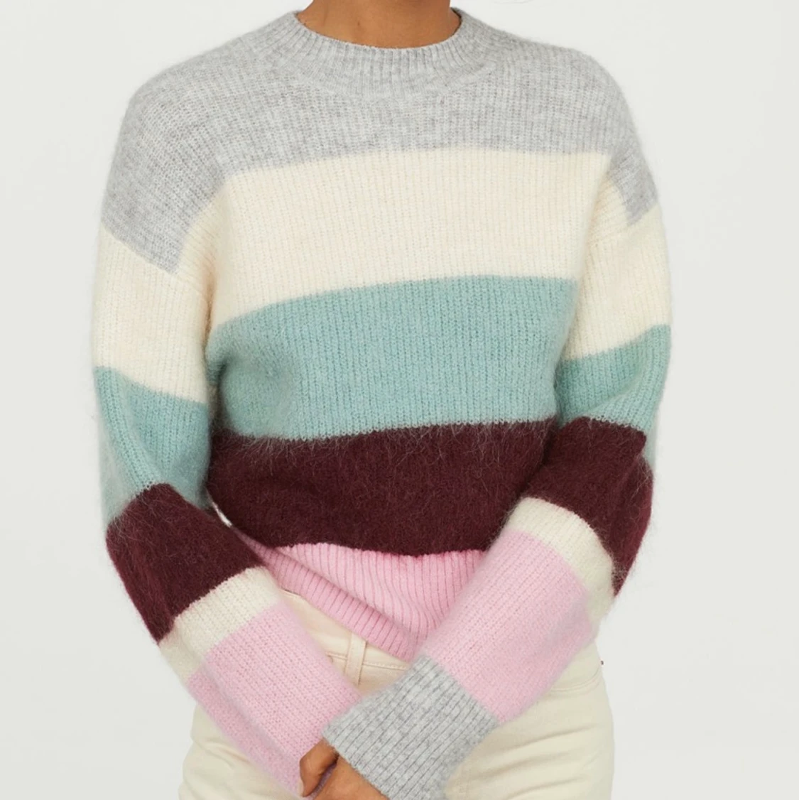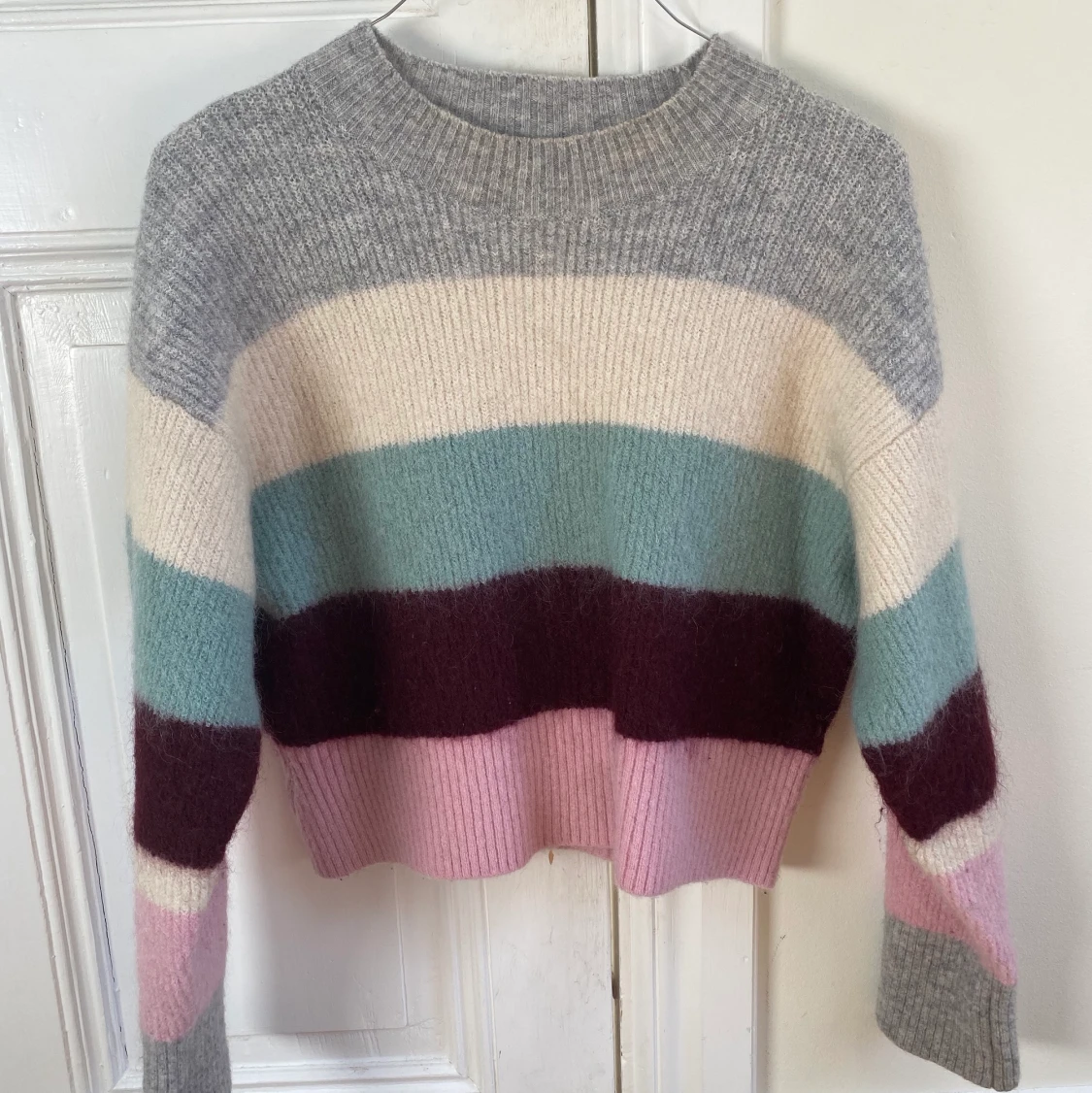 Randig stickad tröja från hm i storlek M, men eftersom jag råkat krympa den en aning i tvätten är den mer som en S/XS.