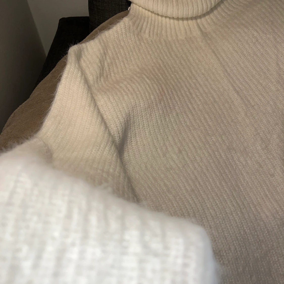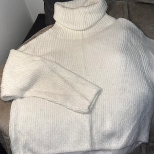 Fluffigt vit croppad stickad tröja. Hög polokrage och på mig (har långa armar) lite kortare ärmar. Väldigt skönt material.