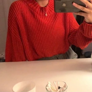 Röd stickad tröja från h&m. Den är i storlek L och sitter lite oversized på mig som brukar ha s/xs. Den är använd 2/3 gånger❤️