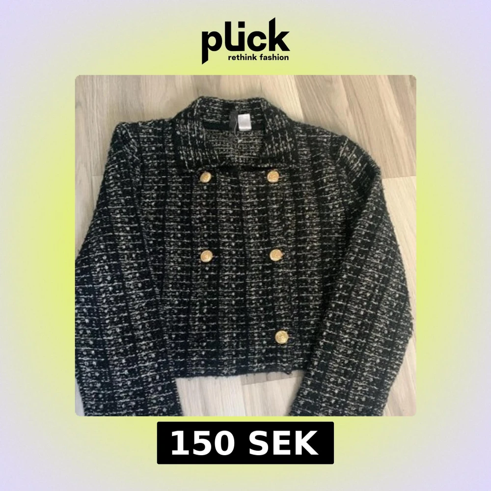 Snygg svartvit rutig cardigan jacka med coola guldknappar framtill. Jackan har en boxig, croppad passform och är långärmad. Materialet är stickat och ger en mjuk och trendig känsla. Perfekt för dig som vill ha en chic och stilren look. Pris kan diskuteras