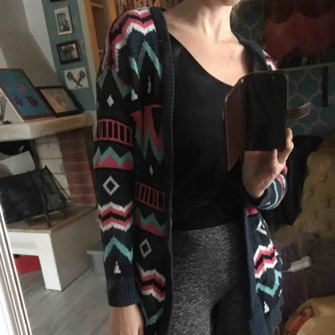 Mycket snygg stickad cardigan med mönster. Väldigt skön. Med fickor och utan knappar. Snygg till jeans eller klänning. Bra skick!