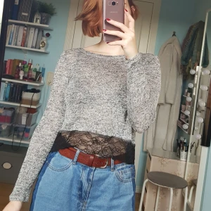 Finstickad gråmelerad mycket tunn tröja med snygg spetskant