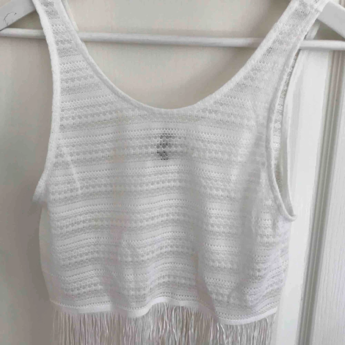 vit stickad magtröja med fransar, använd fåtal gånger, säljer den för att den är för liten. köparen står för frakten