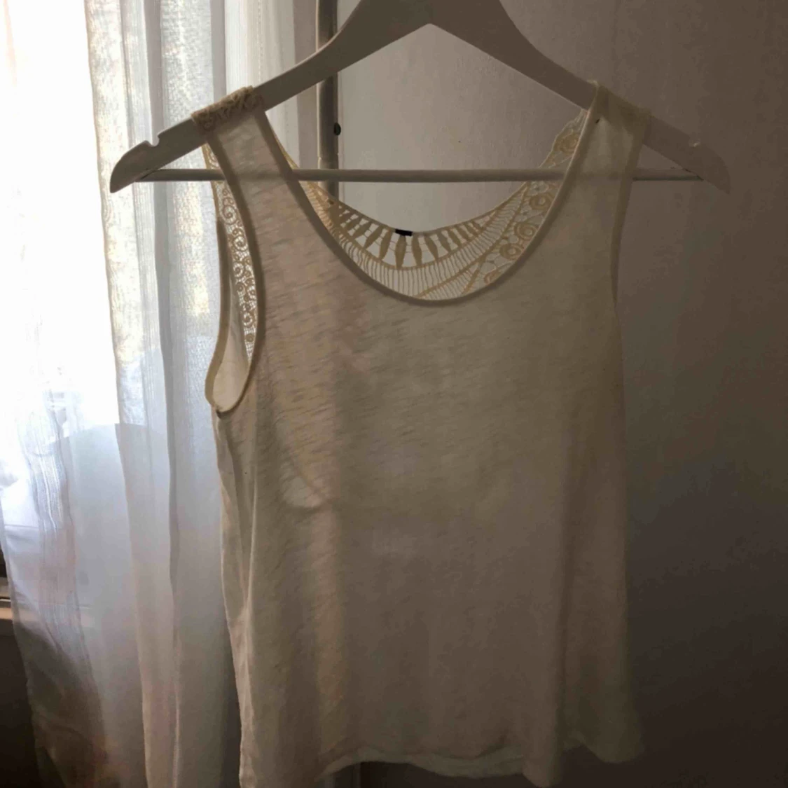 Vitt linne med "stickad spets" bak. Super snygg till sommaren. Använd fåtal gånger 👍🏼 Köparen står för frakt 💗
