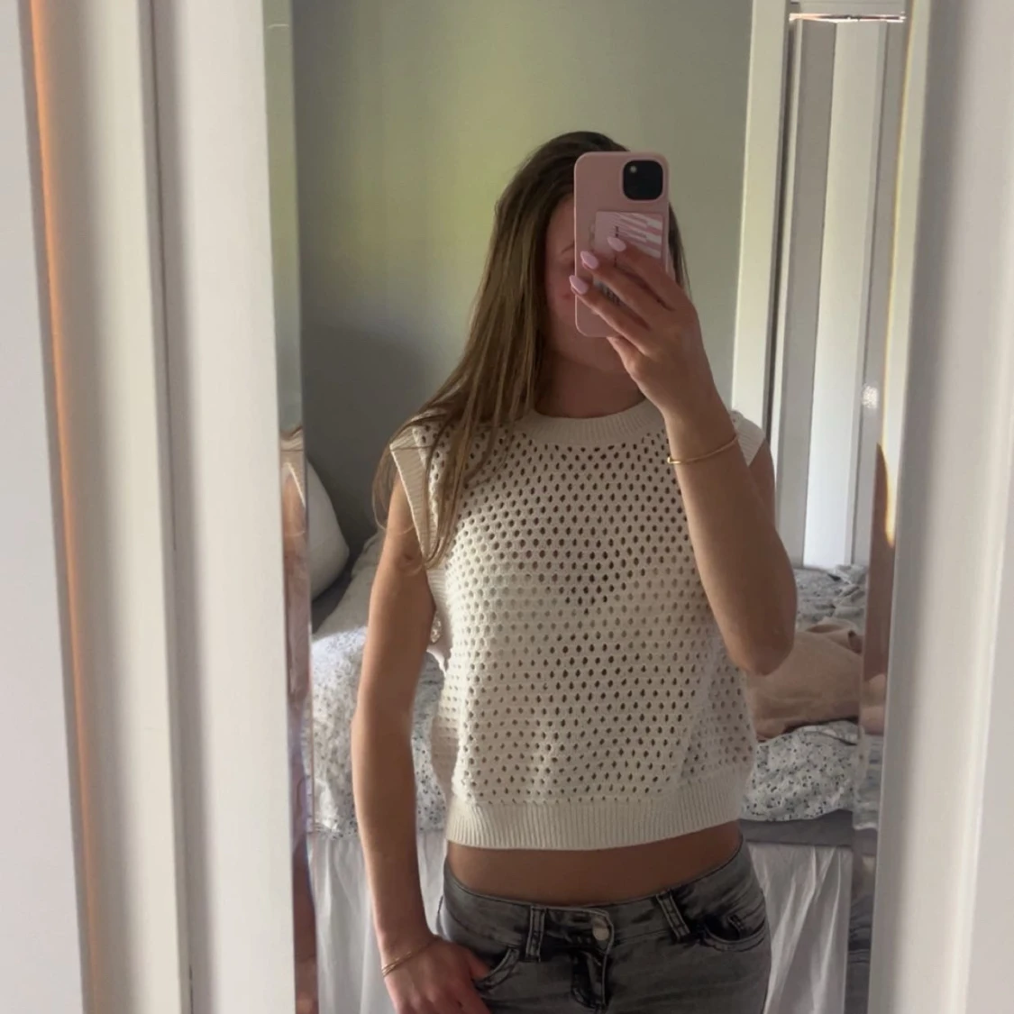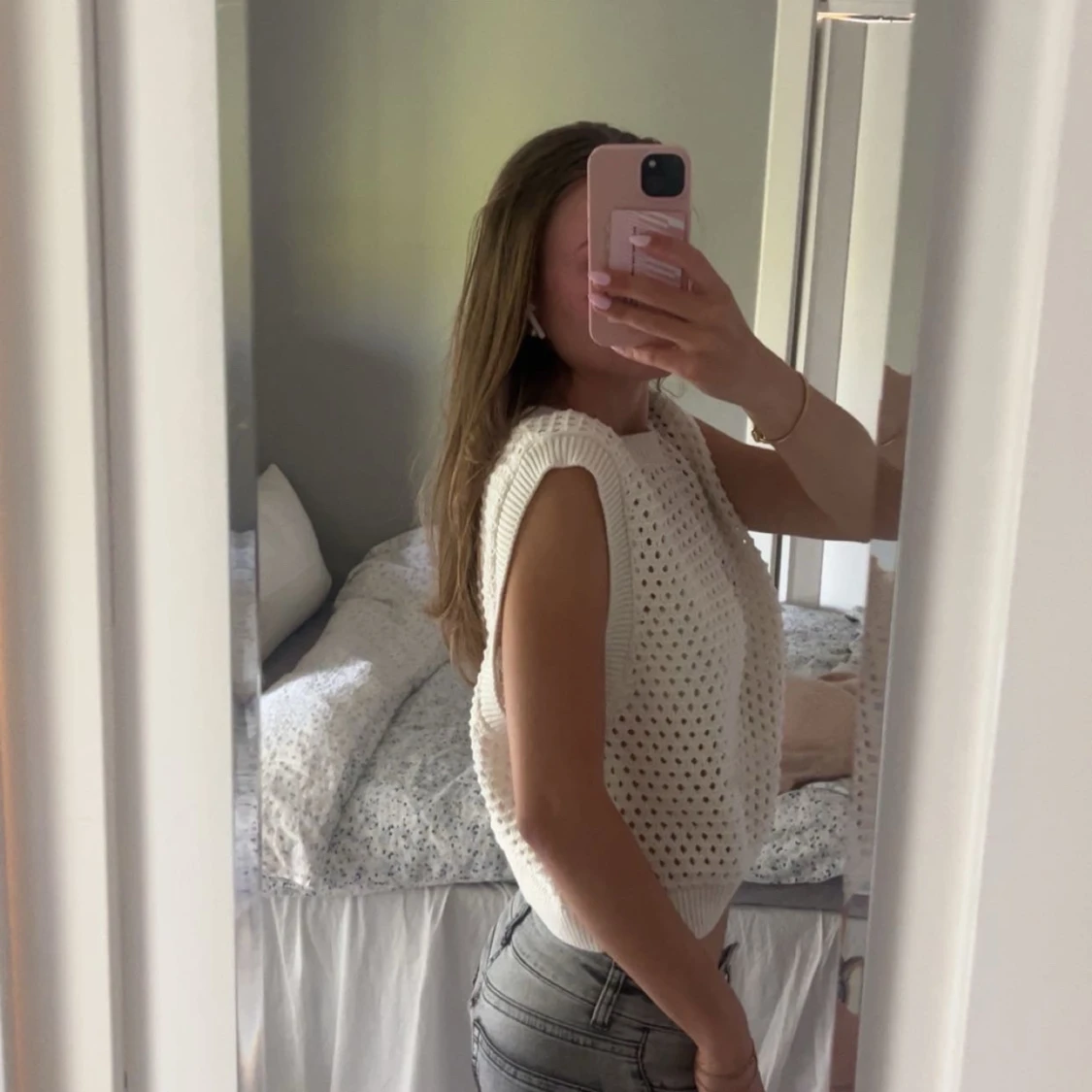 Säljer denna vita stickade västen med grovt hålmönster och breda axelpartier. Trendig väst perfekt nu till sommaren!