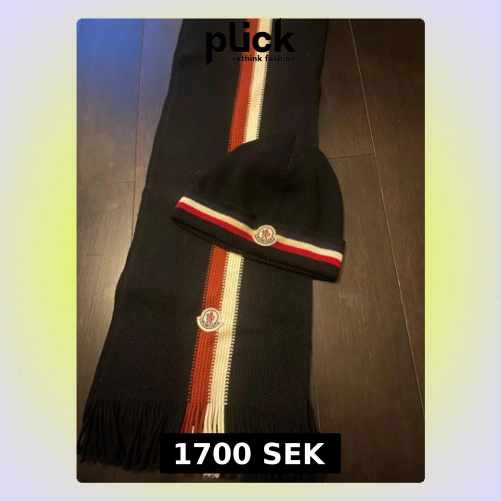 Svart stickad mössa och halsduk från Moncler med klassiska logopatchar. Mössan har röd, vit och marinblå rand vid kanten. Halsduken har ränder i rött, vitt och svart samt fransar i ändarna. Perfekt för att hålla stilen under kalla dagar. Äkta