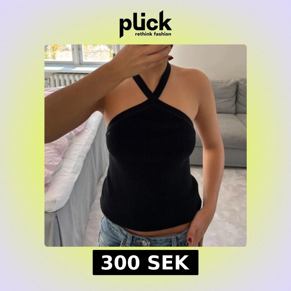 Säljer en svart stickad halterneck topp med ribbad struktur. Toppen har korsade band framtill och knyts i nacken, vilket ger en snygg öppen rygg.