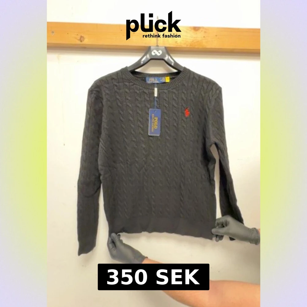 Snygg svart stickad tröja med klassiskt kabelstickat mönster och röd broderad logga på bröstet. Rund hals och långa ärmar, perfekt för lager-på-lager. Tröjan har en mjuk och skön känsla som passar till jeans eller chinos.