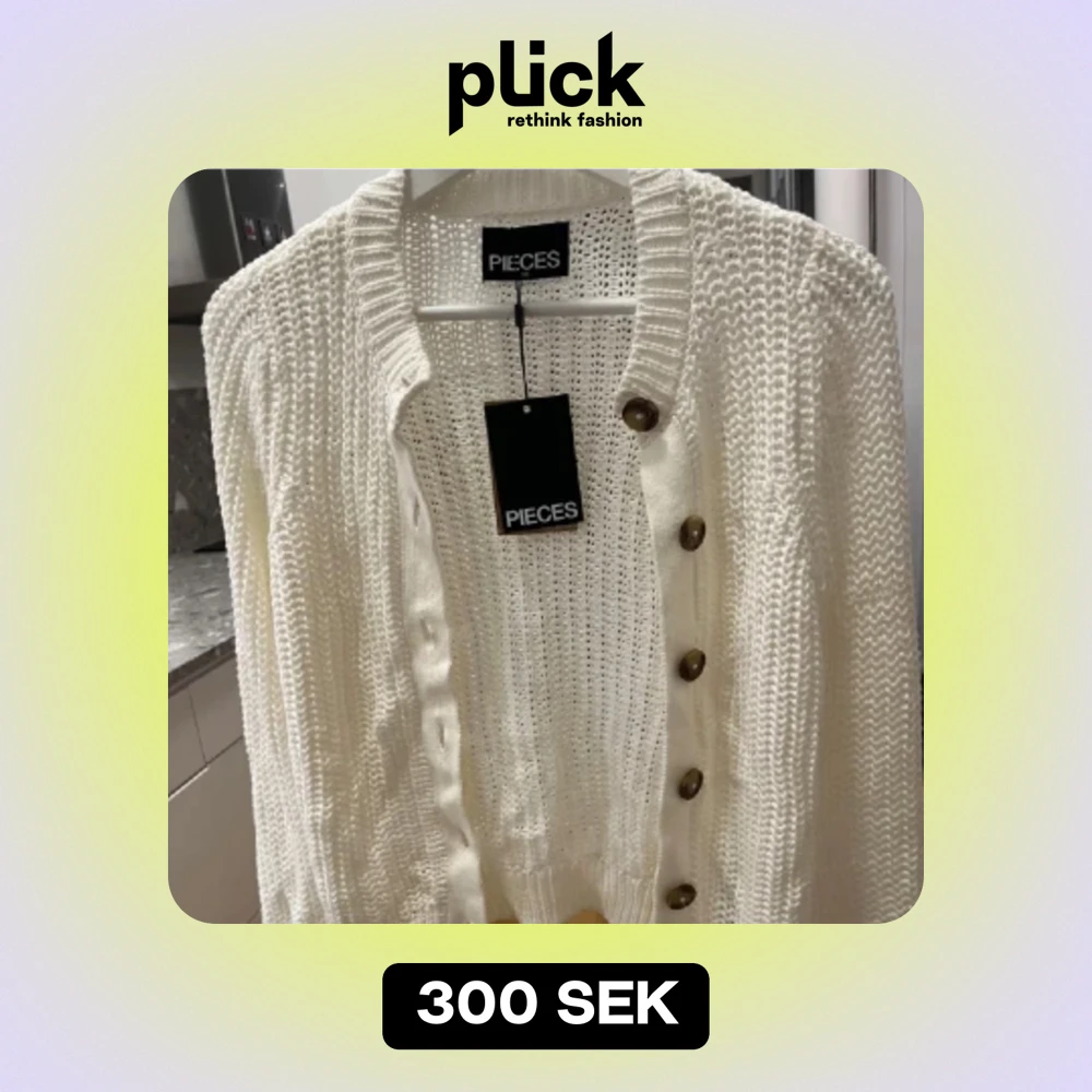Säljer en superfin vit stickad kofta från Pieces. Den har stora knappar framtill och en mysig, ribbad struktur. Perfekt för kyliga dagar när du vill vara både varm och stilren. Helt ny med tag kvar!